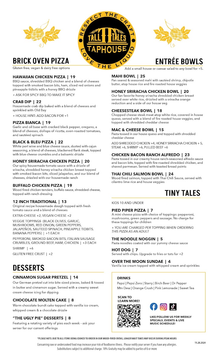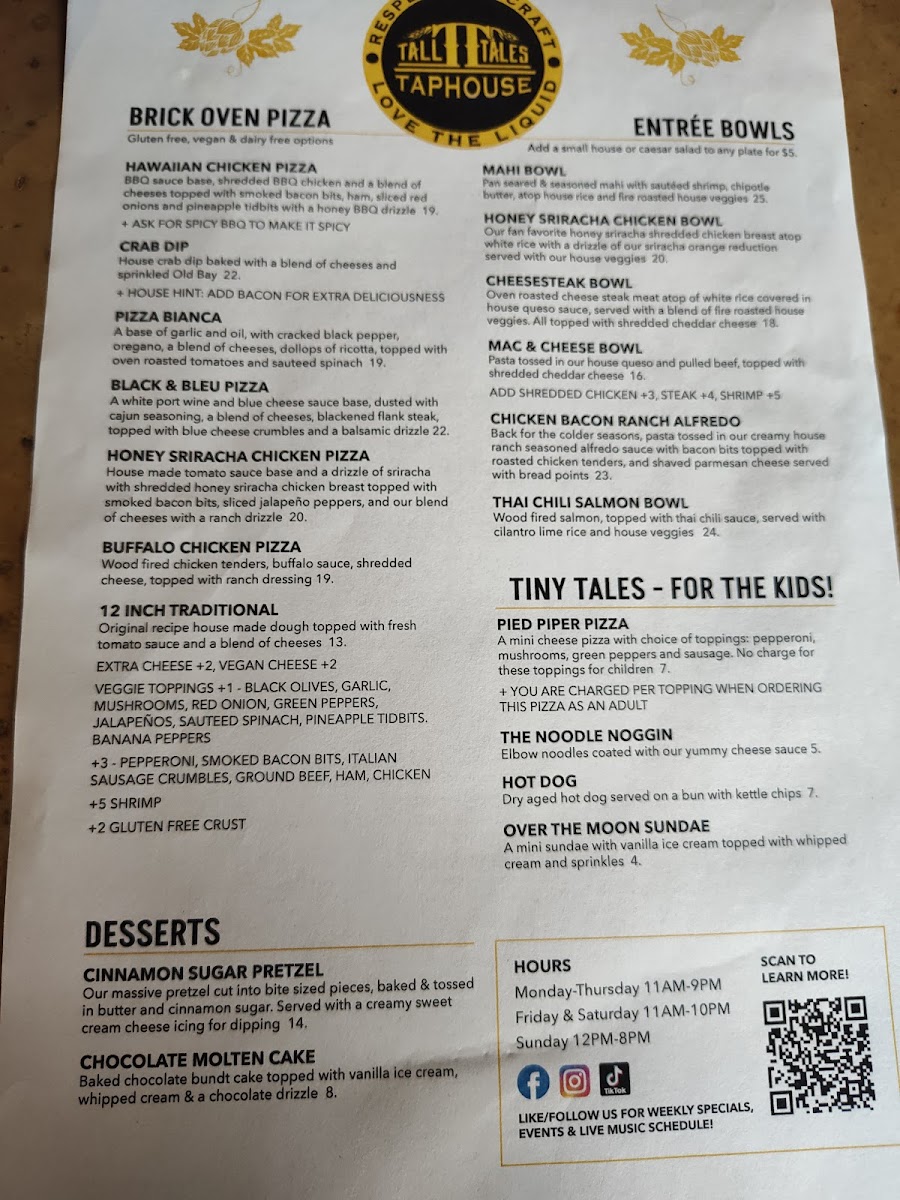 Kids and dogs are welcome, making it a perfect family-friendly spot. With an outdoor patio adorned with twinkling lights and a vibrant playground, Tall Tales promises a delightful dining experience any time of year. Don't miss their scrumptious crab dip pizza and house-made soup!
